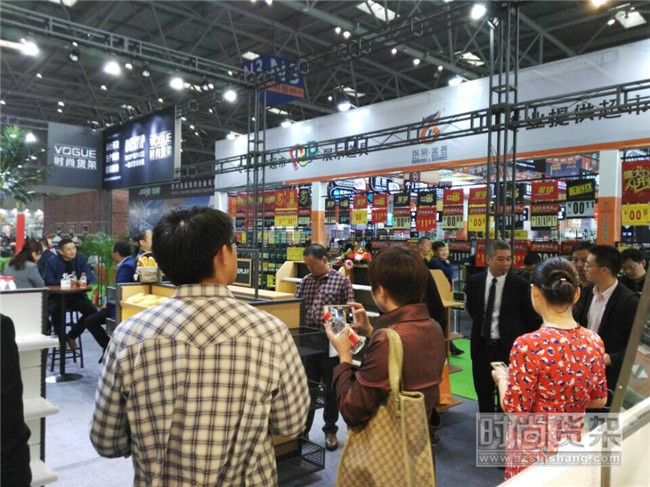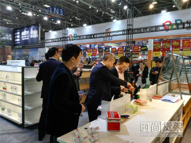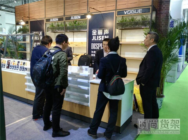 前來參觀的觀眾聚集在時尚貨架的展位內(nèi),仔細欣賞時尚貨架的每一款陳列道具。