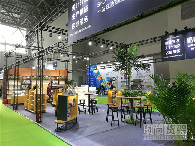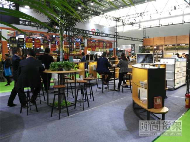 時尚貨架展位內(nèi)還特意擺放了幾組吧臺,既方便讓觀眾坐下來了解貨架產(chǎn)品,又可供觀眾休息歇腳。