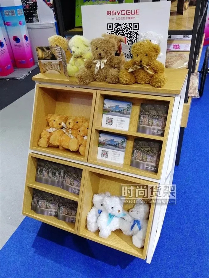 在展架前端傾斜設(shè)置一組小方柜,不僅增加了商品陳列的面積,更方便身高不夠的小朋友拿取,一舉兩得。