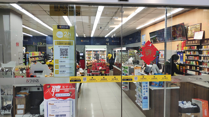 區(qū)別于常規(guī)的無人便利店,在更換為電子自動門之后,蘇寧小店Biu×24h白天安排店員正常經(jīng)營,夜間10點(diǎn)到清晨7點(diǎn)則改為無店員值班,化身無人便利店。消費(fèi)者需掃描電子會員碼進(jìn)店,使用自動收銀機(jī)即可進(jìn)行自助掃碼結(jié)賬。