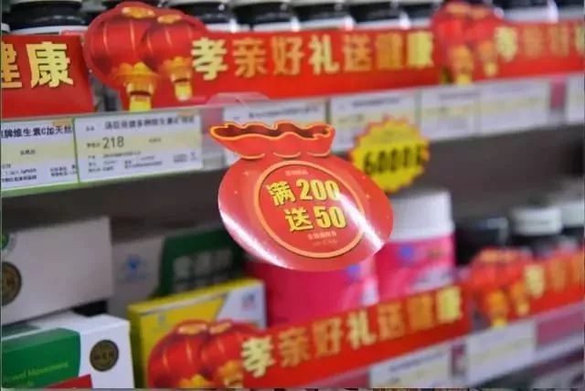 紅色的pop廣告牌本就喜慶搶眼,再加上福袋樣式的廣告卡上“買200送50”的活動(dòng)字樣,與“孝親好禮送祝福”的活動(dòng)標(biāo)語(yǔ)潛移默化的影響著顧客,激發(fā)他們將藥店貨架上的藥品帶回家的欲望。