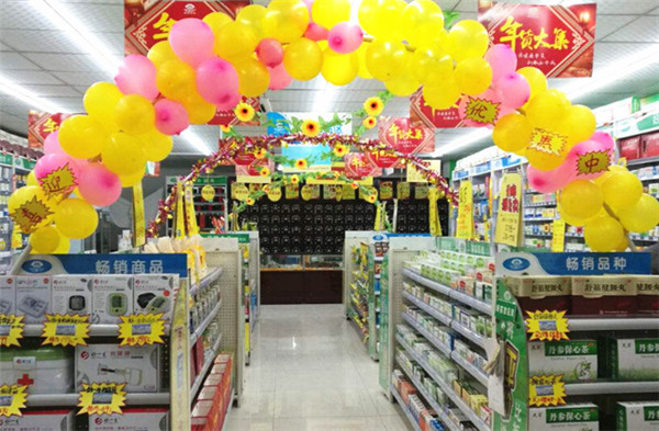 將顏色鮮艷的氣球做成龍門,布置在陳列保健品的藥店貨架周邊,打破藥店死板固有的死板形象,吸引顧客注意力,讓顧客駐足選購。
