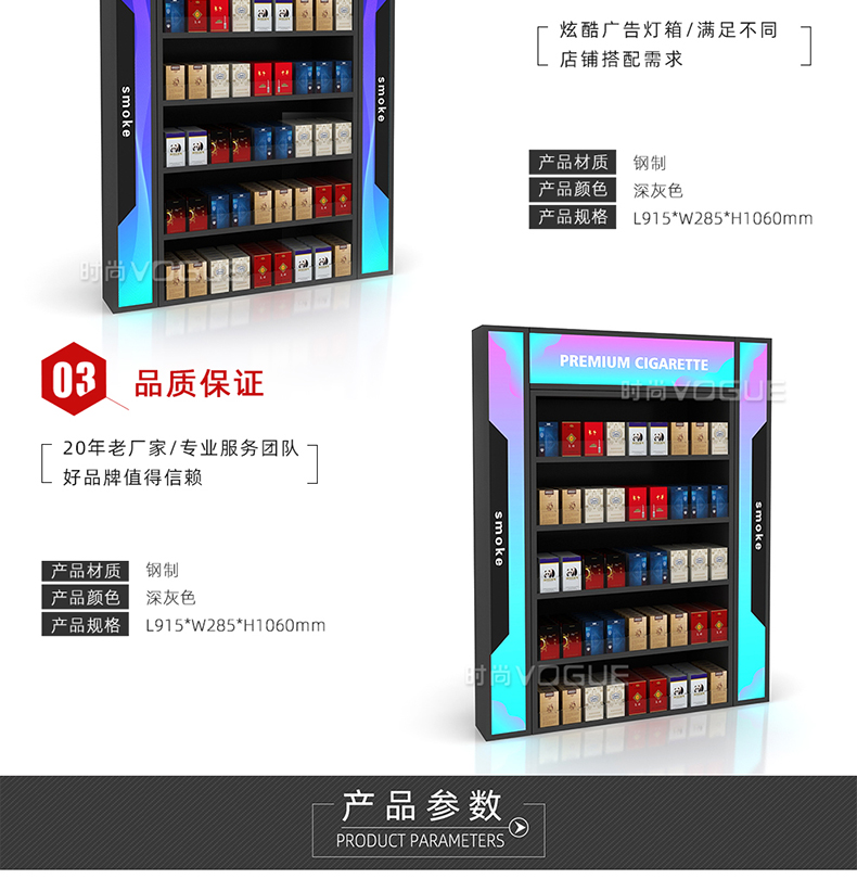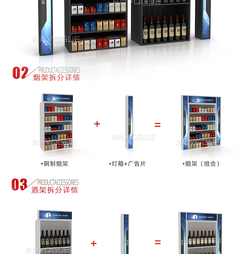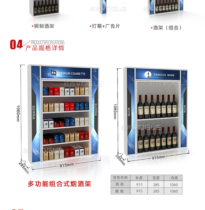 【描述】此款便利店貨架是時(shí)尚貨架為便利店收銀區(qū)設(shè)計(jì)的而一款收銀臺(tái)煙酒架。它由便利店煙架、便利店白酒架、收銀臺(tái)紅酒架組合而成。便利店煙酒架立柱采用優(yōu)質(zhì)鋼材,具有很好的承重能力。頂部配有磁吸燈箱廣告牌,即可宣傳品牌,又可以指引顧客,讓整個(gè)收銀區(qū)的工作效率顯著提高。此款收銀區(qū)煙酒架是框架式結(jié)構(gòu),可以直接放置在收銀背柜上,穩(wěn)定性和安全性很好。